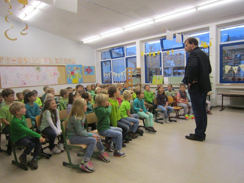 Höhepunkt der Frederick-Woche war die spannende Lesung des Autors Armin Pongs. Aufregung herrschte schon im Vorfeld, denn der Autor hatte ausrichten lassen, jedes Kind möge etwas Grünes anziehen. Die Kinder waren gespannt auf die „Lesung mit Liegestützen“.